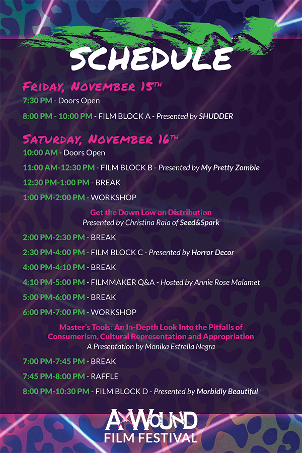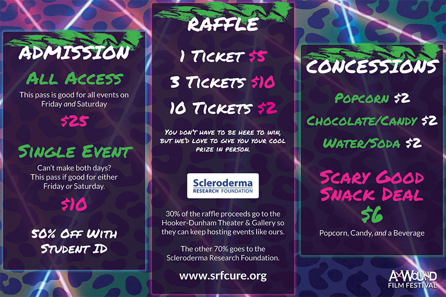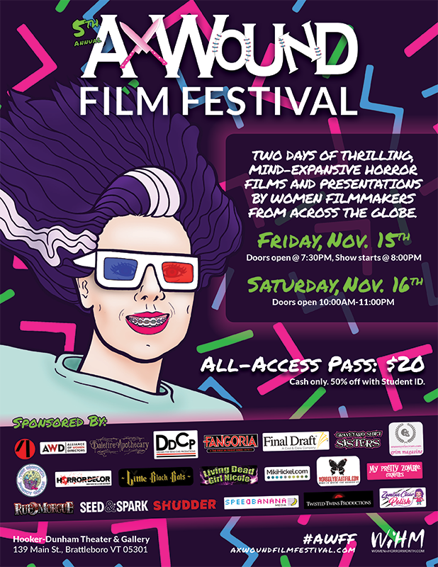 The 5th annual Ax Wound Film Festival (AWFF) took place on November 15-16, 2019. The Hooker-Dunham Theater & Gallery in Brattleboro, VT allowed us to spend two days celebrating women who make horror films. This project required many different kinds of deliverables. Flyers, stickers, badges, web assets, a print program, etc. helped the event succeed.